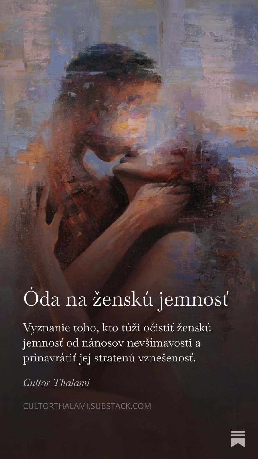 "Dovoľ mi, prosím, postaviť sa medzi Teba a tento svet. Svet, ktorý zhrubol v bezohľadnej maskulínnej dravosti a nadmernej vulgárnosti. Svet, ktorý je slepý voči Tvojmu vnútru a zaujíma ho len výkon, zatiaľ čo úplne prehliada to najcennejšie: krehkú jemnosť a nevysloviteľnú krásu ženského srdca."