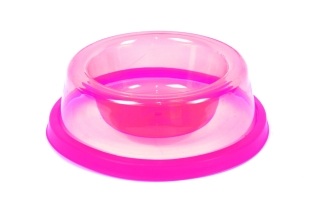 Praktická priesvitná miska pre psa ružovej farby s priemerom 11,5 cm. Materiál: plast. Na spodnej časti misky je guma, ktorá sa dá odobrať z misky.