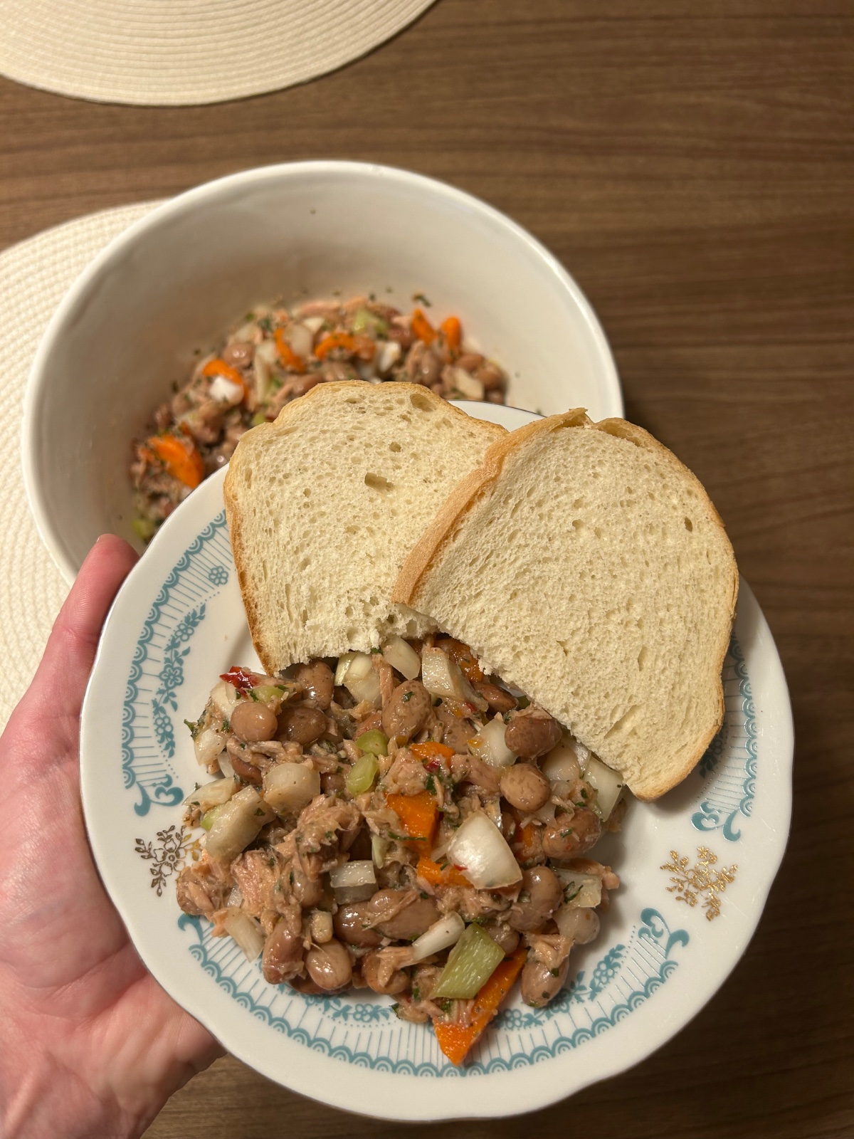 Niečo ako mexický salatUvarená fazula,tuniak,cibuľa,paprika,mrkva z vyvaru,petrzlenova vňať,citrónová sťava,sol,sušený cesnak a 2 PL swet chilli omáčky. Keby som mala rajciny,tak by som ich pridala.