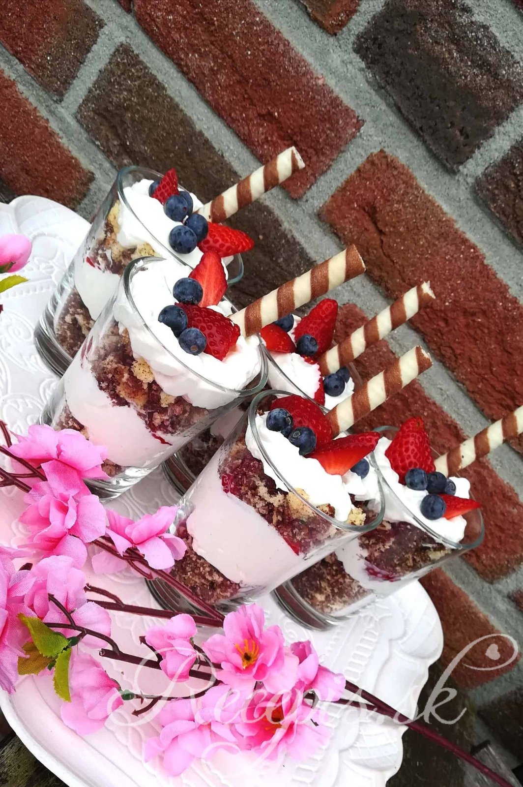 Vyslahaj slahacku s pras.cukrom,zmiesaj s mascarpone a pridaj par kvapiek citronu ci limetky. Na dno pohara daj pomlete keksy,krem,ovocie a dookola