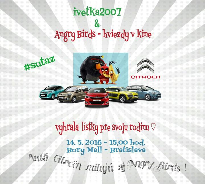 @ivetka2007 už si pripravená?...cestuješ do Blavy.-) Gratulujem a ďakujem za naj prispevok do súťaže #citroen_angrybirds. Lístky na film Angry Birds pre Tvoju rodinku sú Tvoje! Užite si to 🙂