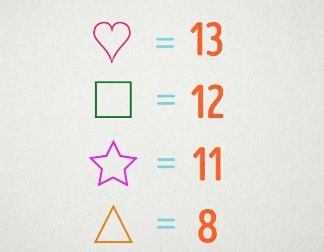 štvorec = 12, hviezda = 11, trojuholník = 8, srdce = 13