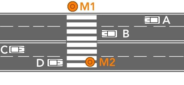 Musia zastaviť,. Je to vo vyhláške, že ak vstupi chodec na priechod, nesmie ohroziť, môže obmedziť, Po ľavej strane M2 obe musia zastaviť.(M1 ak vstúpi na priechod, by mal zastaviť vodič A,) nakoľko vodič B zastavil a čaká, kým prejde M2 ale môže vodič A i pokračovať v jazde, ak by šiel rýchlo, a M1 nevstúpi na priechod
