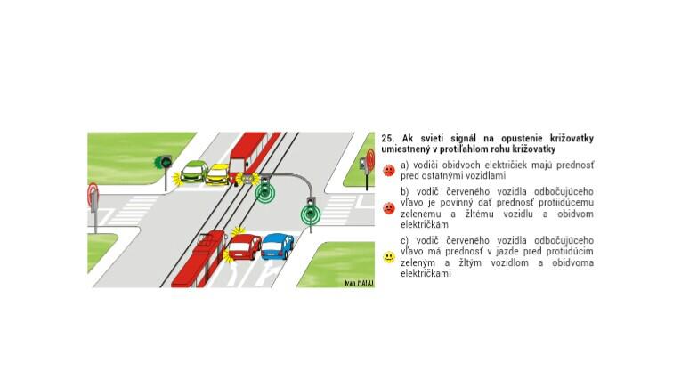 - Ak svieti signál na opustenie križovatky umiestnený v protiľahlom rohu križovatky, vodič červeného vozidla odbočujúci vľavo má prednosť v jazde pred protiidúcim zeleným a žltým vozidlom a oboma električkami🙂