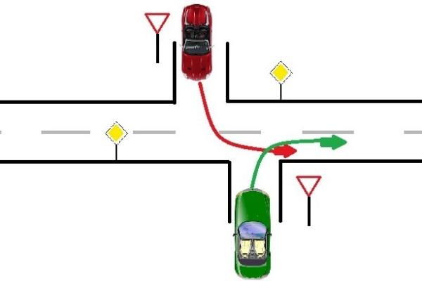 Ťažko povedať, pretože v praxi by bola určite označená aj križovatka. Teraz je to viac menej kto z koho. Ak červené vyrazí, je už na hlavnej a zelené mu dáva prednosť. Ak bude šikovnejší druhý vodič, ide prvý on, lebo mu nič nekrižuje cestu. Je to v tomto prípade na dohode.