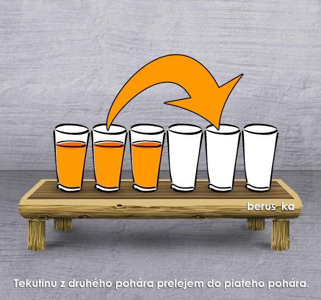 Ste ma dali dolu 😅 ...vezmeš druhý pohár v poradí a jeho obsah vyleješ do piateho pohára a položíš ho naspäť 😉