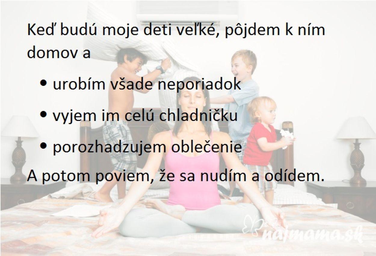 My už s mužom máme nachystaných pár vecí, čo sa vyhrážame, že sme deťom dlžní. Napríklad že sa im ako puberťákom postavíme o druhej v noci k posteli a budeme vrešťať na celý dom. Môj muž sa tiež vyhráža, že im odžerie z každého jedla, odpije z čaju tak aby doň napúšťal krokodíly a bude im vbiehať na WC počas potreby. Ja mám v pláne im dať do topánok lego a do postele voskovky, prípadne sa za jeden deň 8O krát opýtať na to isté. Už teraz sa tešíme, ako im to nandáme, harantom. 🙂