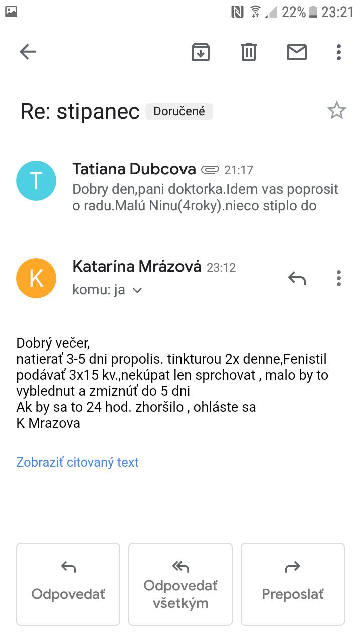 Naša doktorka je tiež taka 🙂 volám jej hocikedy hoci aj o pol noci aj na dovolenku vždy ochotne poradí 🙂 také doktorky sú naj
