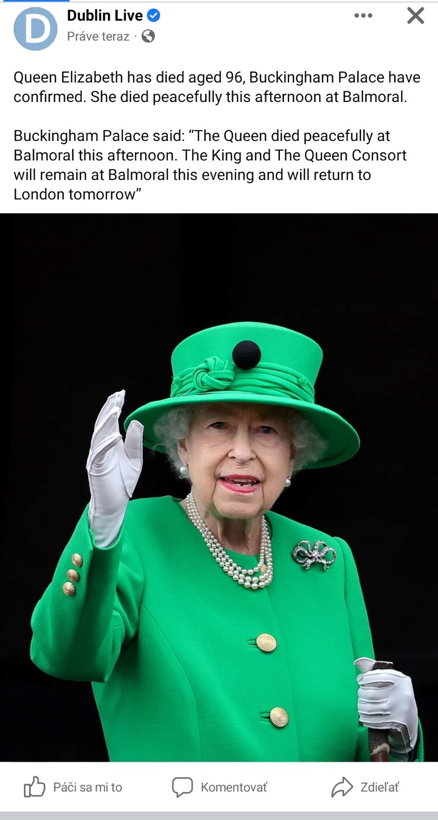 @vla_dan Aký link? Keď kráľovná zomrie, spúšťa sa operácia London Bridge, tak sa to oficiálne volá. A podľa toho, čo je o nej zverejnené je embargo na informácie do 6 večera dňa, kedy panovník zomrie. Písal o tom The Guardian. https://www.theguardian.com/uk-news/2017/mar/16...