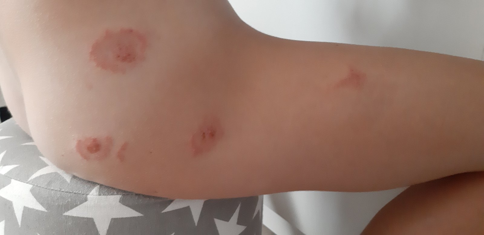 My sme mali úplne rovnaké od leta až do teraz, zistili sme to len náhodou návštevou našej mačičky na veterine (veterinárka nám povedala, že má plesne a že tie sa prenášajú na človeka, či nemáme fľaky po tele).... pred tým sme obišli všetky možné lekárky, dcéra má aj histamínovú intoleranciu, ale nebolo to nakoniec z toho, pretože som to mala aj ja a ja ju nemám. Boli to nakoniec teda mačacie plesne, 1,5 mesiaca sme brali terbinafín a maste na plesne batrafen....zisťovali to z krvi a sterom. A už sme končene nad tým zvíťazili. Vraj je toho teraz veľmi veľa a lekári to často nevedia zistiť....
