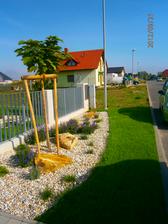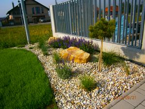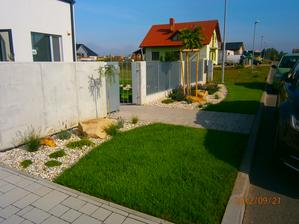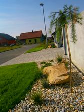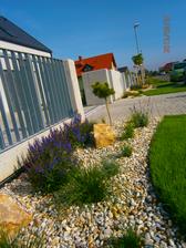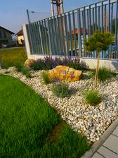 popis: jedná sa o predzahrádku pred moderným rodinným domom. Plocha predzahrádky je vďaka komunikáciam členená na veľa malých častí. Mojou úlohou bolo zjednotiť predzahrádku tak aby posobila ako jeden súvislý celok. Preto som zvolila organickú líniu, ktorá trochu kontrastuje s moderným domov ale navzájom sa podporujú. Výsadba je moderná s dominantným rodinným stromom. Výsadba je mulčovaná kamienkami malej frakcie. Takto vynikne zelená farba výsadby a trávnika. Výsadba je moderná, jednoduchá a vzdušná. Je tu použitá kombinácia farieb zelenej a fialovej. Na údržbu je predzahrádka takmer bezúdržobvá.