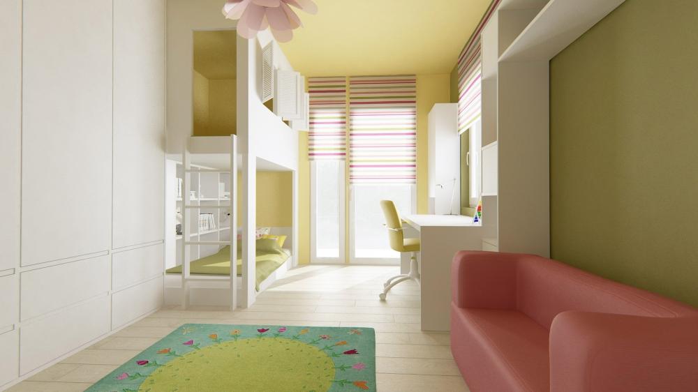 Kút na spanie v dievčenskej izbe sa dispozične vypýtal do výklenku, ktorý sa nachádza vľavo od vstupu. Je chránený od zvedavých pohľadov a hluku bežnej prevádzky v byte. Záhlavie postele vytvára knižnica, ktorá môže poslúžiť aj ako nočný alebo aj raňajkový stolík.