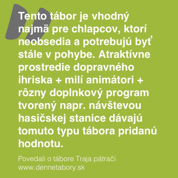 Máte doma malých nezbedníkov a premýšľate nad táborom? Skúste tábor Traja pátrači. Deti sa vybláznia na kolobežkách či bicykloch, spoznajú pravidlá cestnej premávky, a okrem iného, stretnú sa aj s políciou. Tábor odporúčame hlavne pre chlapcov. Viac tu: http://bit.ly/traja-patraci