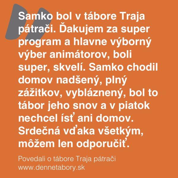 Toto sú slová Samkových rodičov o tábore Traja pátrači. Okrem toho, že sa deti výborne odreagujú, naučia sa aj pravidlá cestnej premávky. Viac na: http://bit.ly/traja-patraci