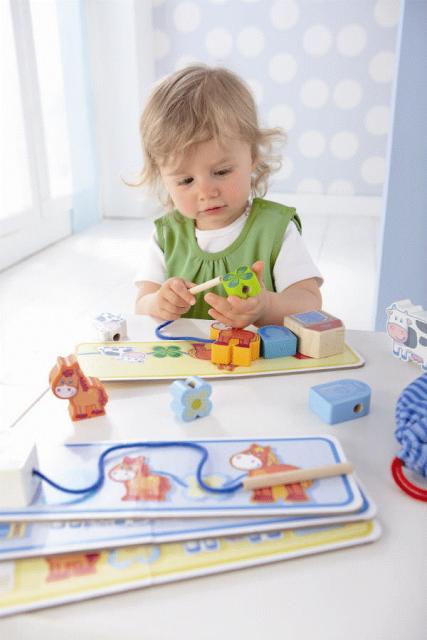 Drevená palička na konci šnúrky uľahčuje dieťatku manipuláciu a navliekanie. Jednoznačne odporúčame na rozvoj jemnej motoriky pre najmenších !