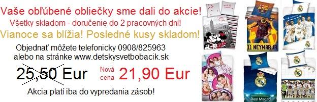 Vaše obľúbené obliečky sme dali do akcie! Stará cena 25,50 Eur, nová cena 21,90 Eur, platí iba do vypredania zásob, objednať môžete telefonicky 0908/825963 alebo na stránke www.detskysvetbobacik,sk, prípadne na nižšie uvedených linkoch ku jednotlivým obliečkam. Všetky obliečky sú skladom, ešte dnes pošleme, zajtra ich máte doma! Objednávajte, kým sú...