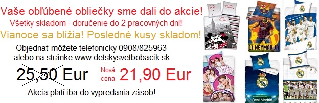 AKCIA AKCIA AKCIA************************Vaše obľúbené obliečky sme dali do akcie! Stará cena 25,50 Eur, nová cena 21,90 Eur, platí iba do vypredania zásob, objednať môžete telefonicky 0908/825963 alebo na stránke www.detskysvetbobacik,sk, prípadne na nižšie uvedených linkoch ku jednotlivým obliečkam. Všetky obliečky sú skladom, ešte dnes pošleme, zajtra ich máte doma! Objednávajte, kým sú...************************************************************************1/ obliečky Minnie New York 100 % bavlna http://www.detskysvetbobacik.sk/detail/5149997/...2/ obliečky Neymar http://www.detskysvetbobacik.sk/detail/5071753/...3/ obliečky Real Madrid Team http://www.detskysvetbobacik.sk/detail/5318589/...4/ obliečky Violetta http://www.detskysvetbobacik.sk/detail/5115999/...5/ obliečky Real Madrid štadión http://www.detskysvetbobacik.sk/detail/5367603/...6/ obliečky Real Madrid Team http://www.detskysvetbobacik.sk/detail/5343372/...