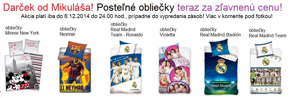 Pripravili sme pre Vás Mikulášske prekvapenie, obľúbené obliečky sme dali do akcie. Akcia platí iba do 6.12.2014 do 24.00 hod. (prípadne do vypredania zásob)