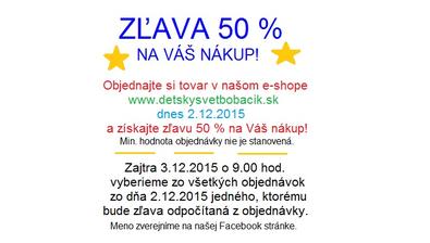 Získajte zľavu 50 % na Váš nákup! Objednajte si tovar v našom e-shope www.detskysvetbobacik.sk dnes 2.12.2015 a zajtra vyberieme jedného komu bude zľava odpočítaná z objednávky. Skladom máme posteľné obliečky s obľúbenými motívmi Frozen, Barcelona, Messim, Real Madrid, Angry Birds a ďalšie a ďalšie, viac ako 500 motívov. Určite si vyberie každý a poteší svoje deti na Vianoce! Objednávajte na www.detskysvetbobacik.sk. Poštovné iba 2,50 eur.