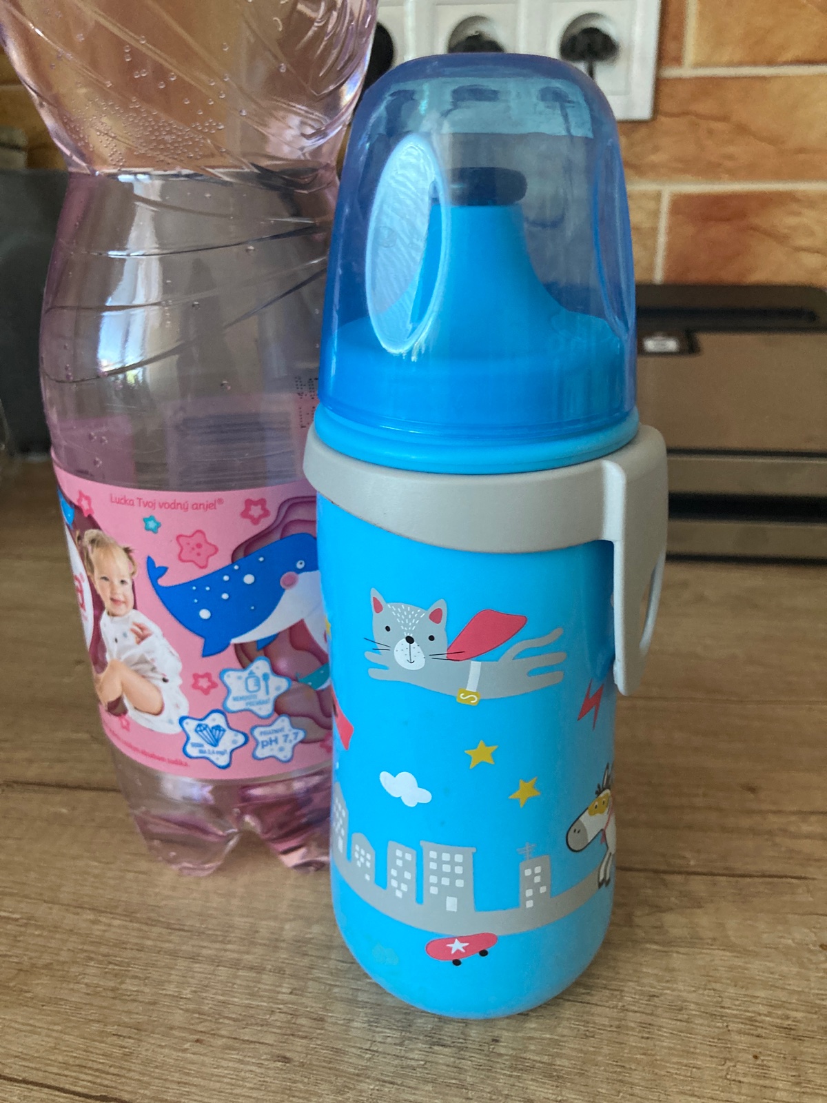Tak táto fľaša k nám prišla práve v hodine 12. Hľadala som fľašu, ktorá netečie a sčasti som ju aj našla. Ide o tvrdšiu fľašu, je odolná proti pádom, užšia a vyššia. Nevýhoda je, že detičky nie sú zvyknuté ten "sosáčik" otvoriť, a že ho musia späť zatvoriť. Dala som do nej ochutenú detskú vodu a ten "sosáčik" vystrelil a premokla nám taška, aj keď väčšia časť vody ostala vo vrchnáku.