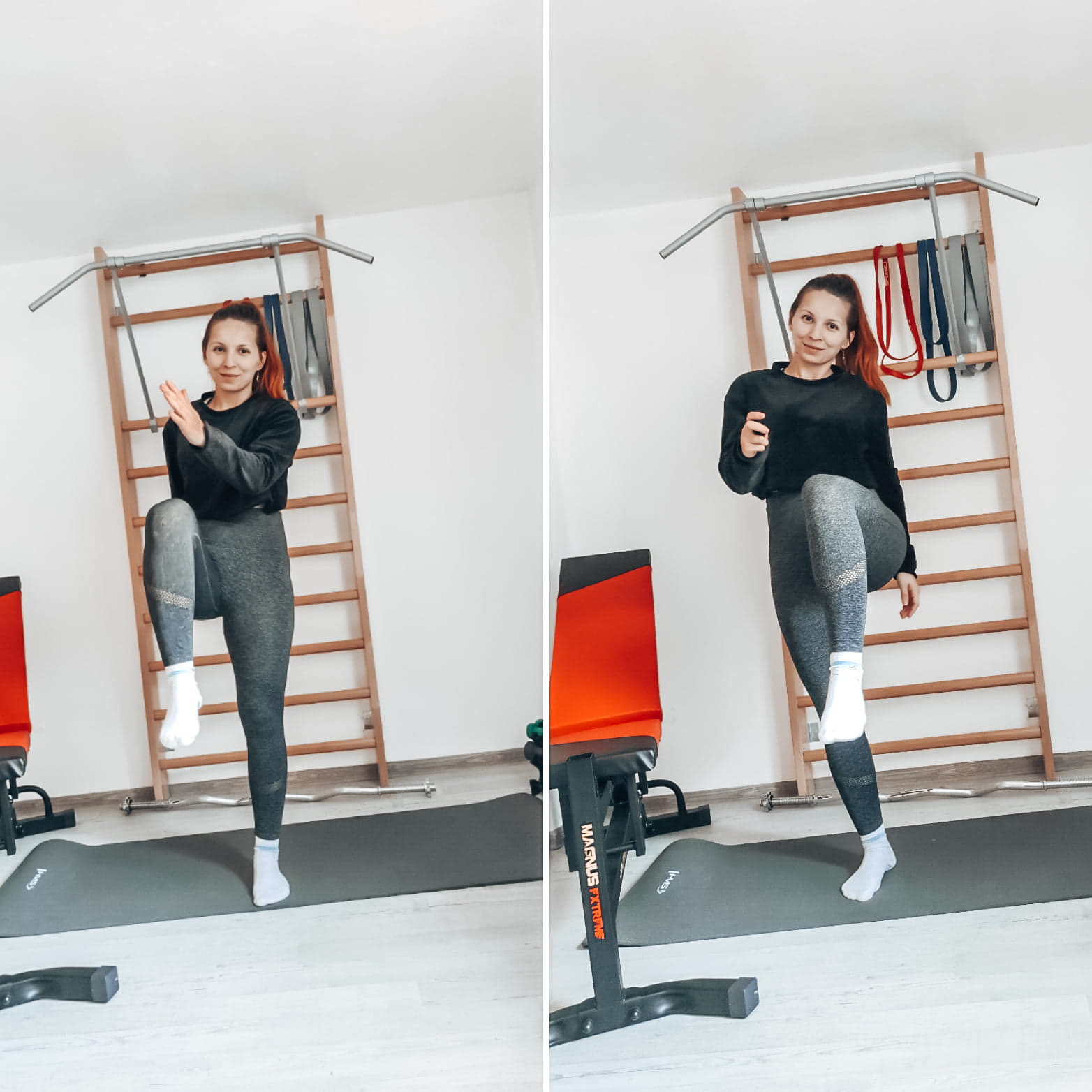 Vysoké kolená, alebo high knees- rovný chrbát, ramená ťaháme dolu, lopatky k sebe, brucho zatiahnuté