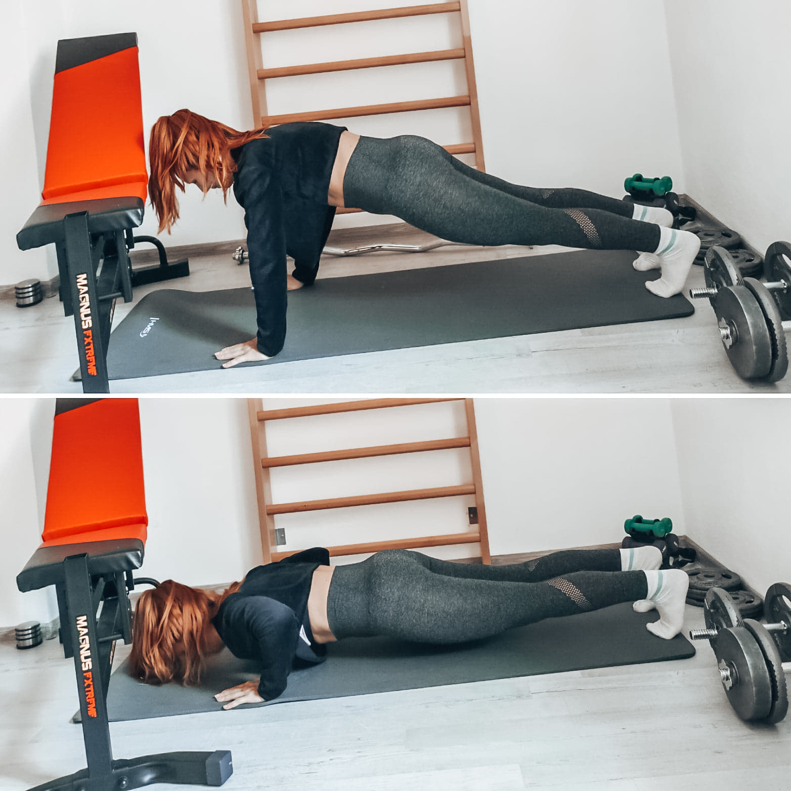 Kliky, alebo push-ups- môžete si vybrať „pánske“ alebo „dámske“, pri oboch máme celý stred tela napnutý a v rovine, brucho ťaháme ku chrbtici, lopatky k sebe, hlava je v predĺžení tela