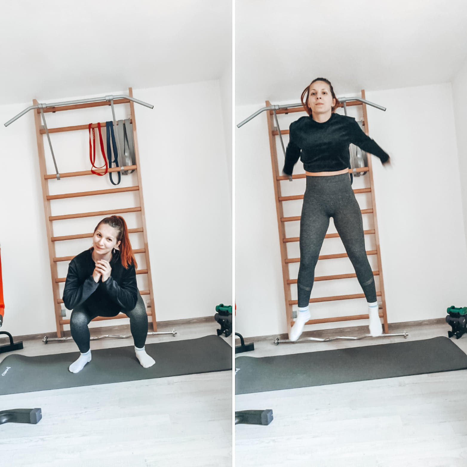 Drep s výskokom, alebo squat jumps- toto je lahôdka na záver :D stále máme zatiahnuté brucho
