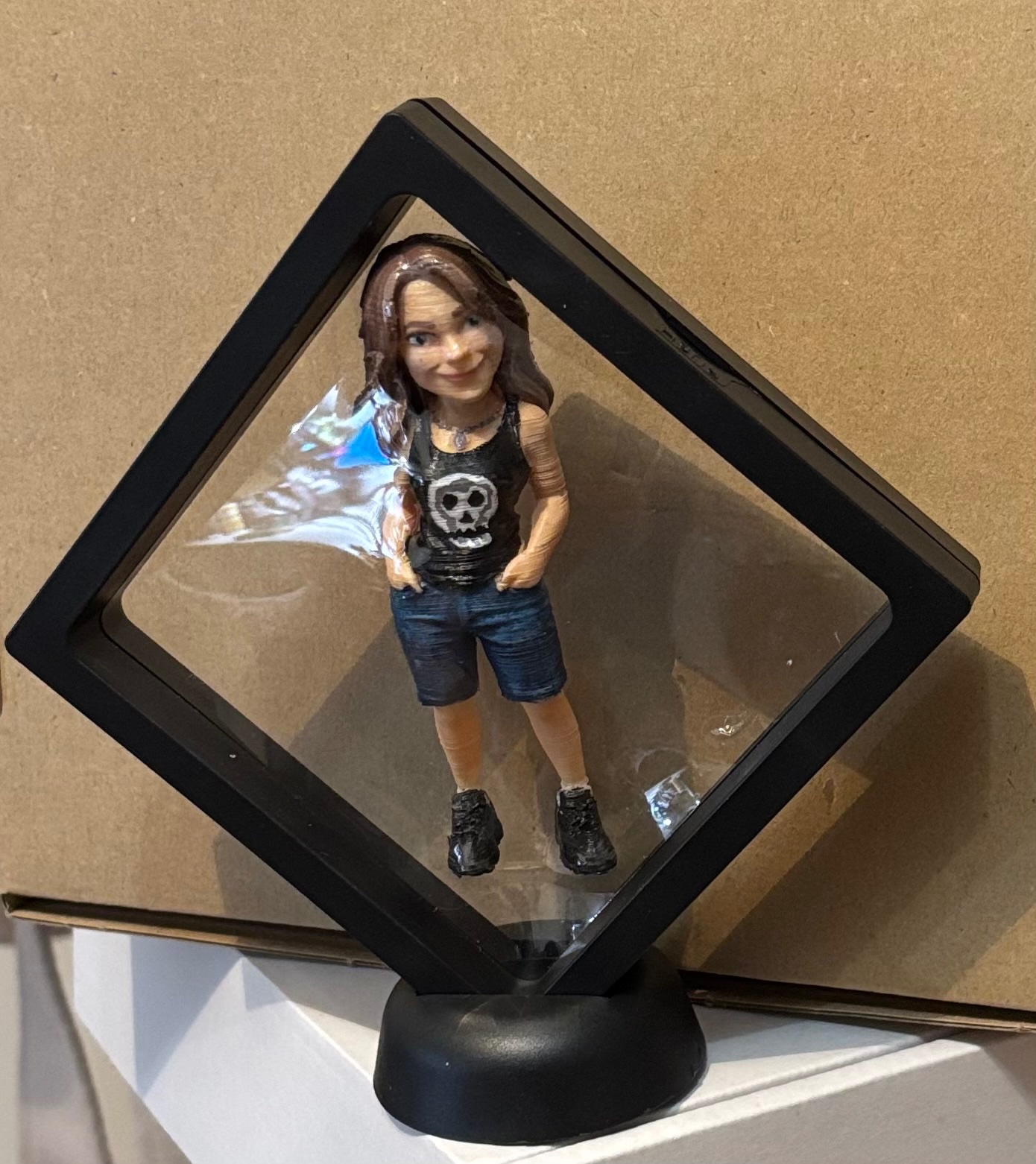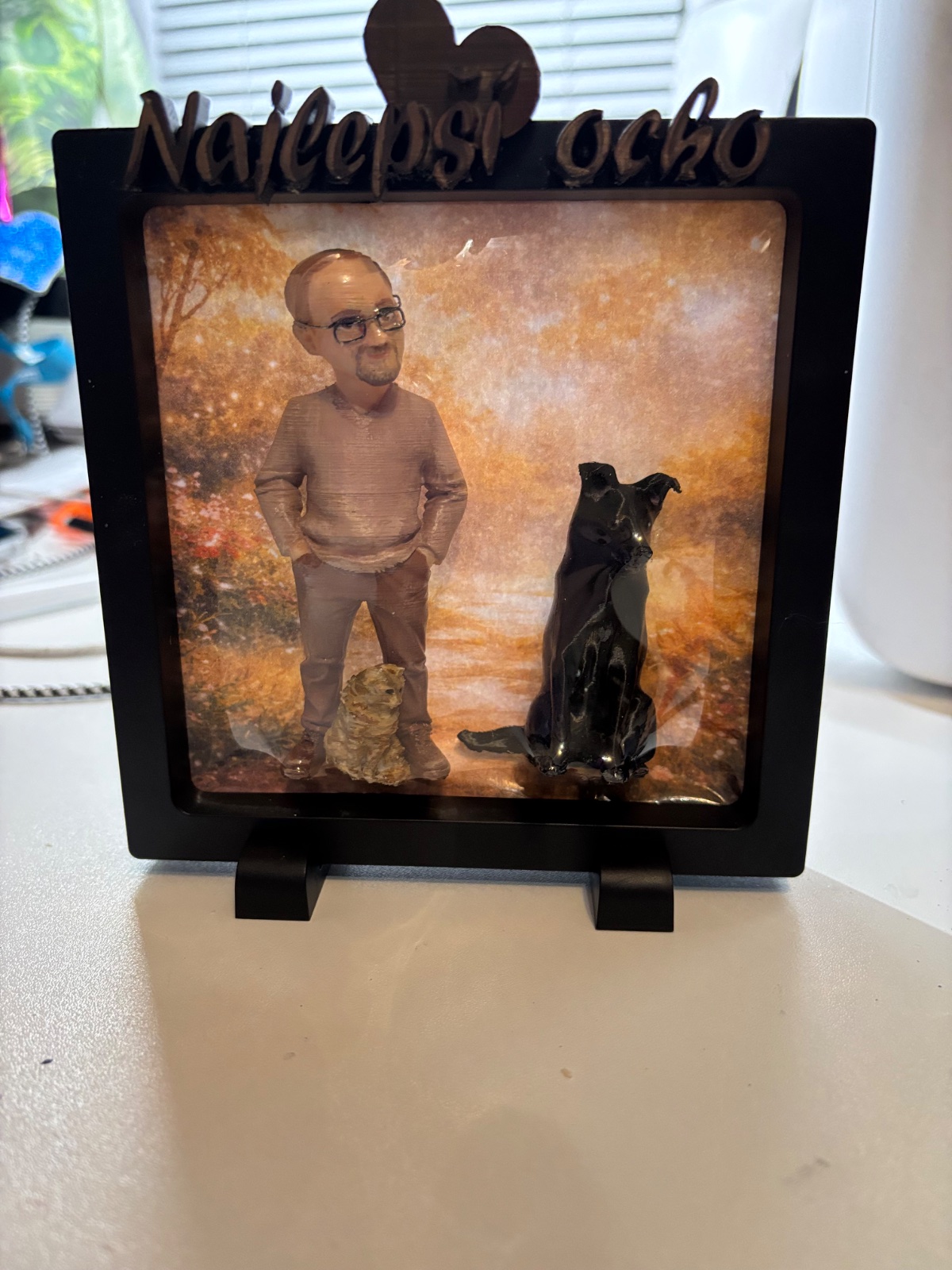 Zienky , uvediem na správnu mieru ,nieje to vymodelovane z hmoty ako takej, z fotky človeka/zvieratka vymodelujem 3D model v programe (co zaberie asi najviac času, niekedy by som ručne asi vymodelovala rýchlejšie 😅), následne nastavím pre tlac, vytlačim na 3D tlačiarni, namalujem,zalakujem, pripravím pozadie, ked tak vytvorím a vytlacim este 3d nápis ☺️