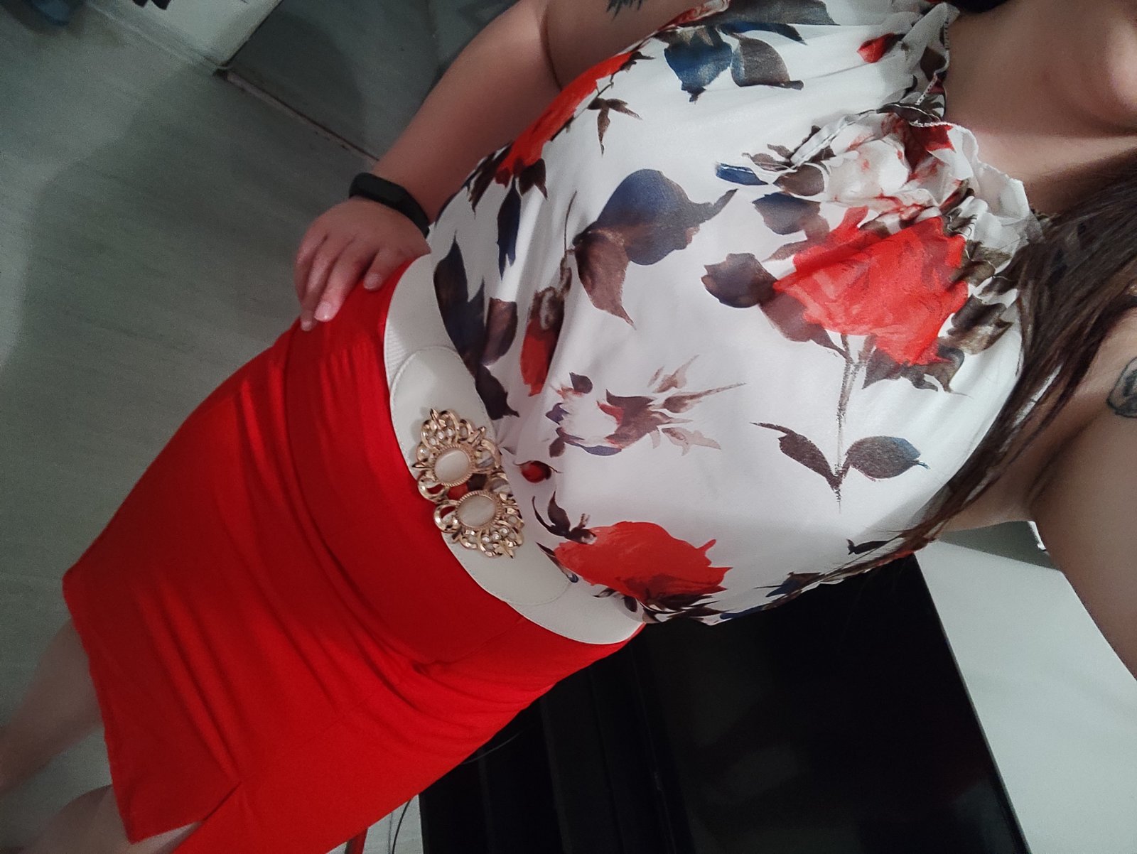 Sukna a bud bodkovany alebo kvetinovy top. Ak sa da, tak bez toho opasku
