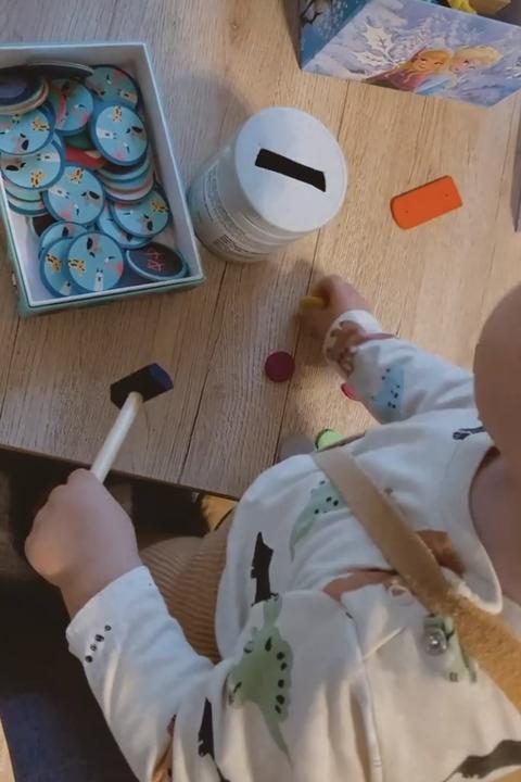 Ak teda chcete peniažky z pokladne dostať von musíte sa s pokladňou pohrať. Drobček môže stláčať farebné páčky na pravom kraji pokladne. Ak stlačí oranžový gombík tak mince vybehnú z boku pokladne jedna po druhej, čo sa Lianke náramne páči. Ak stlačí dieťa žltý gombík tak mince spadnú do kasy. 😉