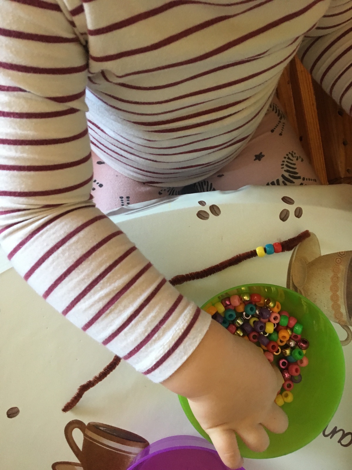 Navliekanie korálok na chlpatý drôtik- hmat, jemná motorika a sústredenie, koordinácia pohybov oci a rúk