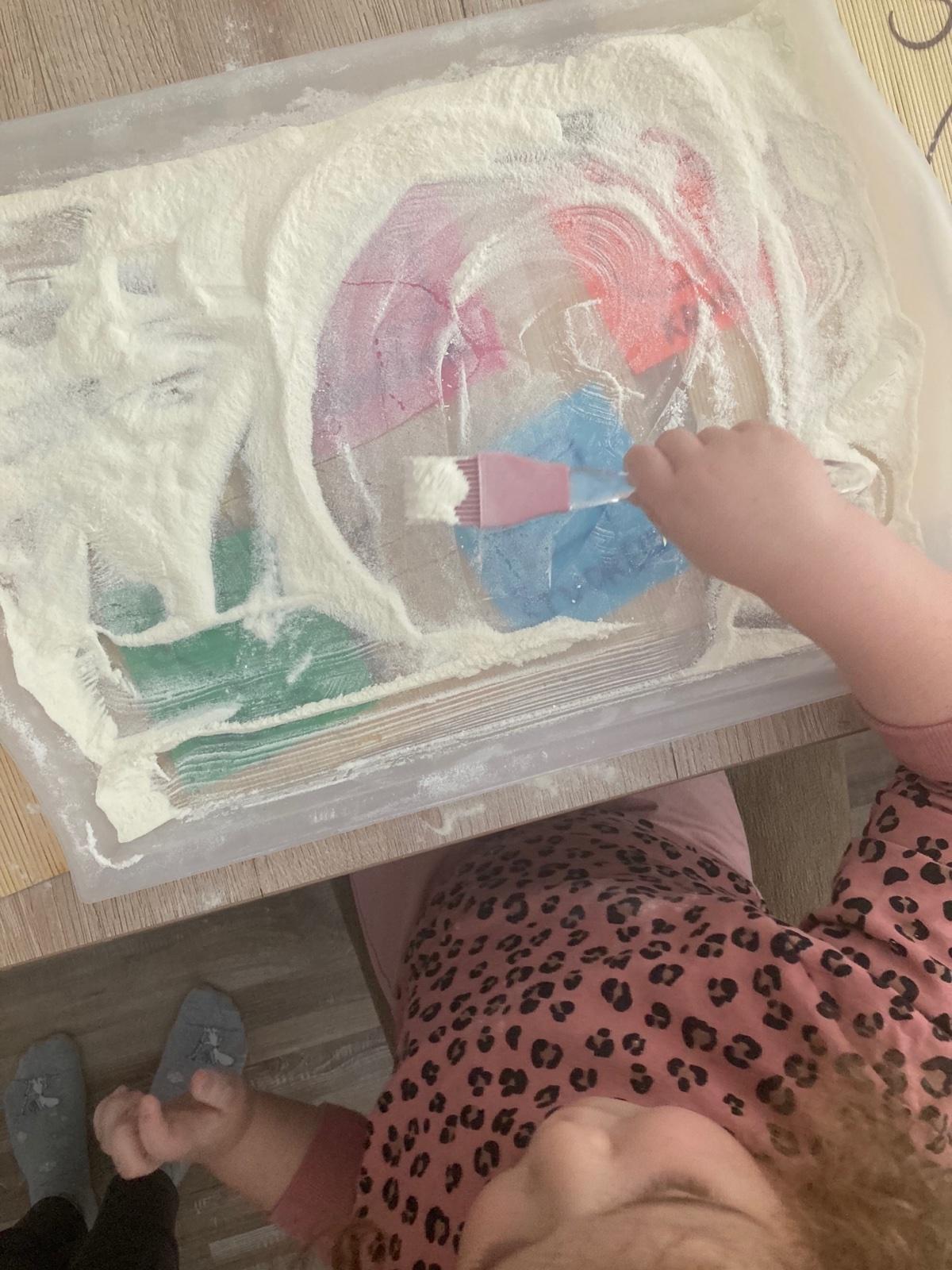 Spoznávanie farieb a tvarov pod múkou pomocou štetca 🙂