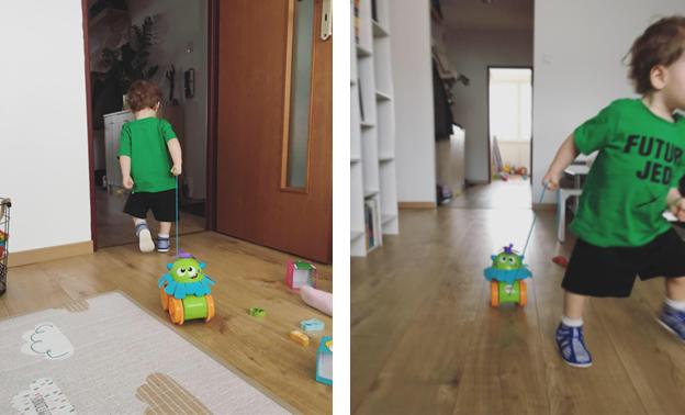 Vďaka šnúrke, ktorú drží drobček v rukách si rozvíja motoriku a úchop. Taktiež je super motiváciou k prvým krokom a hoci je hračka určená od 12 mesiacov, môže veľa ponúknuť aj menším huncútom.