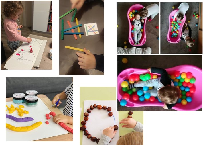 Tieto aktivity sú vhodné najmä na jemnú motoriku, triedenie farieb alebo priraďovanie správnych tvarov. Aj takto si môžete pomocou farebných papierov a lega precvičiť sústredenie. Rolky od toaletného papiera majú tiež veľmi pestré využitie ako recyklohračky a rovnako aj vrchnáčiky od fliaš. Miesto pinzety môže dieťaťa na triedenie vrchnáčikov použiť aj lyžicu alebo kuchynské grilovacie klieštiky (samozrejme s dozorom).