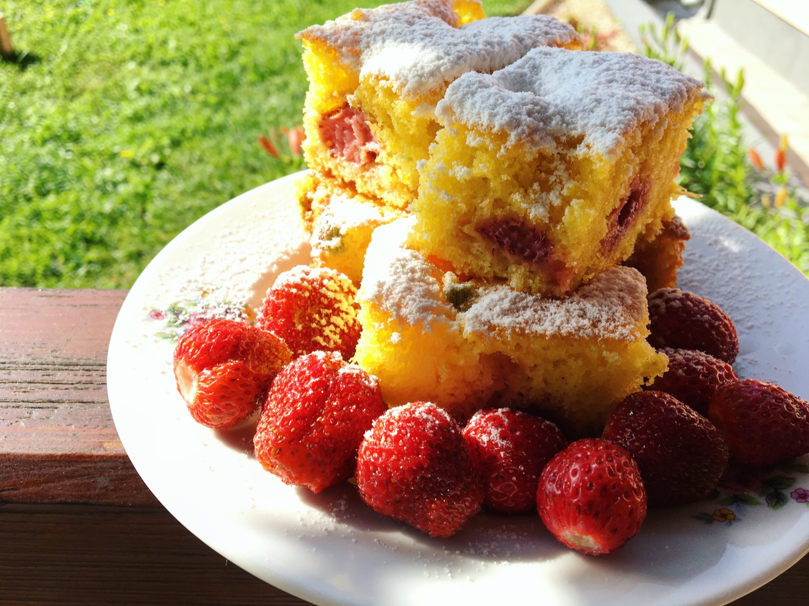 -sneh zmiešame s múkou a práškom do pečiva a so žltkovou penou. Cesto vylejeme na vymastený a múkou vysypaný plech, na vrch poukladajte očistené jahody a očistenú a nakrájanú rebarboru zbavenú “vláskov” 😜