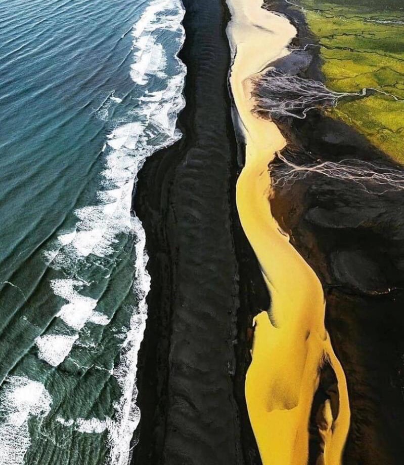 Krásne miesto na Islande, kde sa stretávajú zelené polia, žltá rieka, čierna pláž a modré more. 😊👌🏼