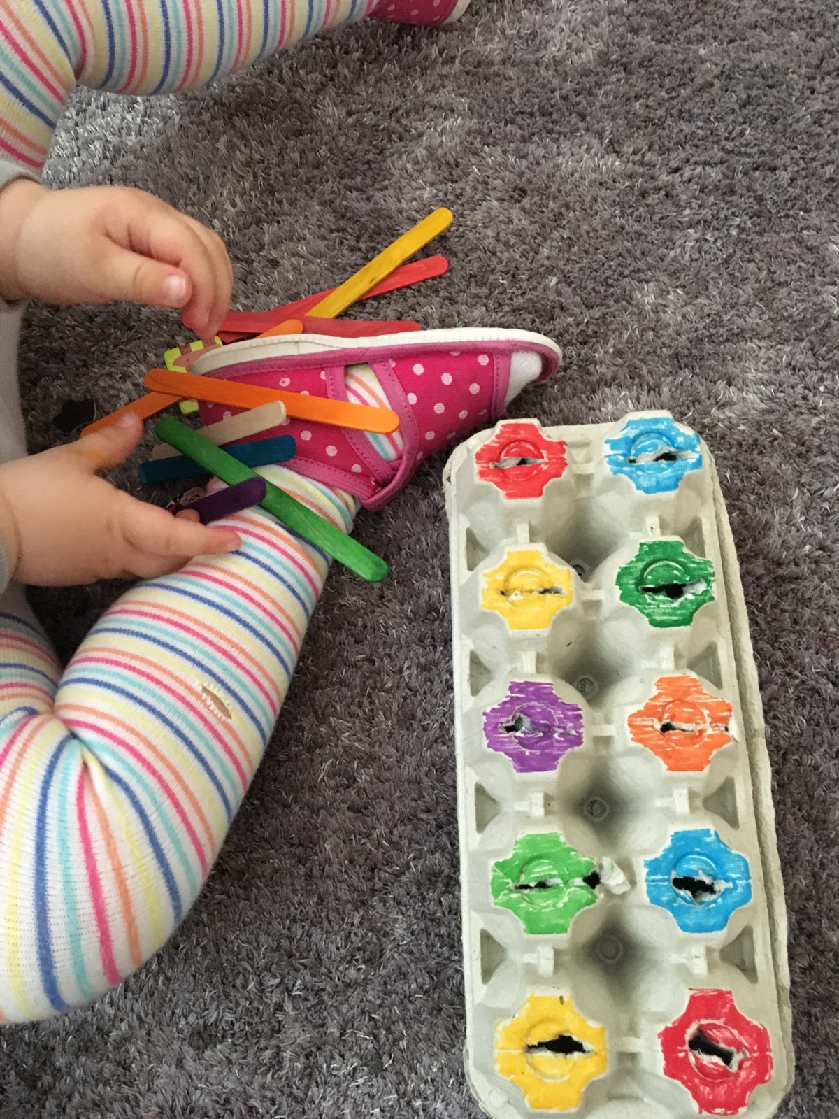 Spoznávame farby a musím povedať, že Lianku to dosť baví 😊😁(PS: Dierka na punčoške je už zaštopkaná 🙈 )