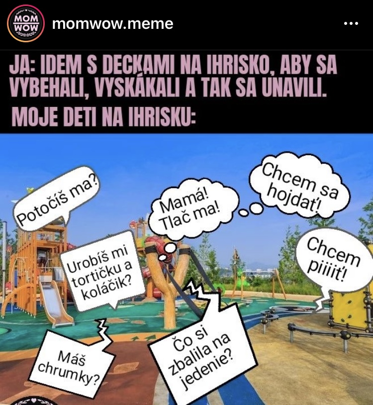 @wrtoshiwa To sú mamy, ktoré majú už veľké deti a sú tam len pre istotu, ja sa k nim radím 🙂 Kým boli krpci menší, to memečko ma úplne vystihovalo. Teraz majú 8, 6 a 4 roky, partiu kamošov a ja tam vlastne chodím len kvôli najmenšiemu, lebo ho vonku nenechám samého. Takže si sedím na lavičke a čítam a občas vyskočím, keď sa niekto bije alebo plače. Ale akonáhle vonku nie sú kamoši, zas spadáme do módu mama pre všetko 😅