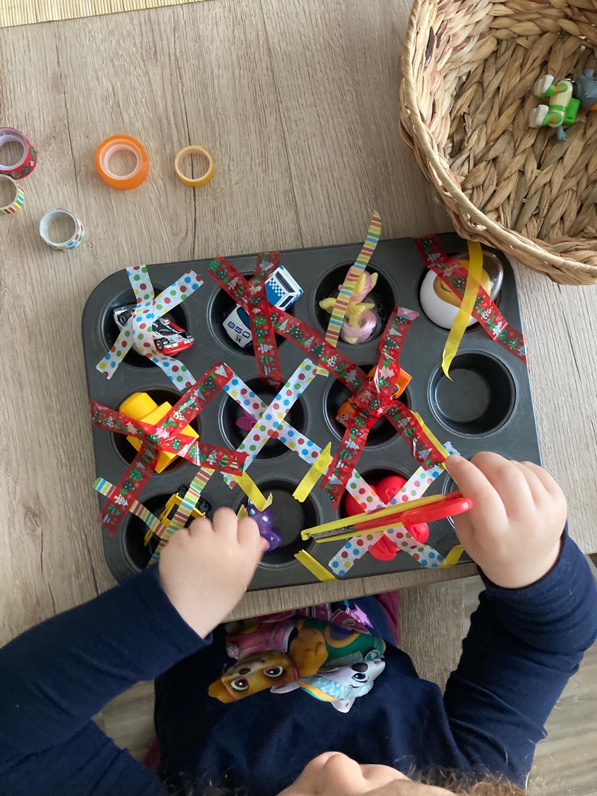 Do formy na mafiny som poukladala drobne hračky, autíčka, Megabloks... a prelepila som ich farebnými papierovými páskami 🙂 Lilka dostala do rúk nožnice a úlohu - zachrániť hračky zo zajatia 😁♥️ Do úlohy sa vložila naplno a tak sme aktivitu opakovali 3x po sebe 🙂🙏🏻