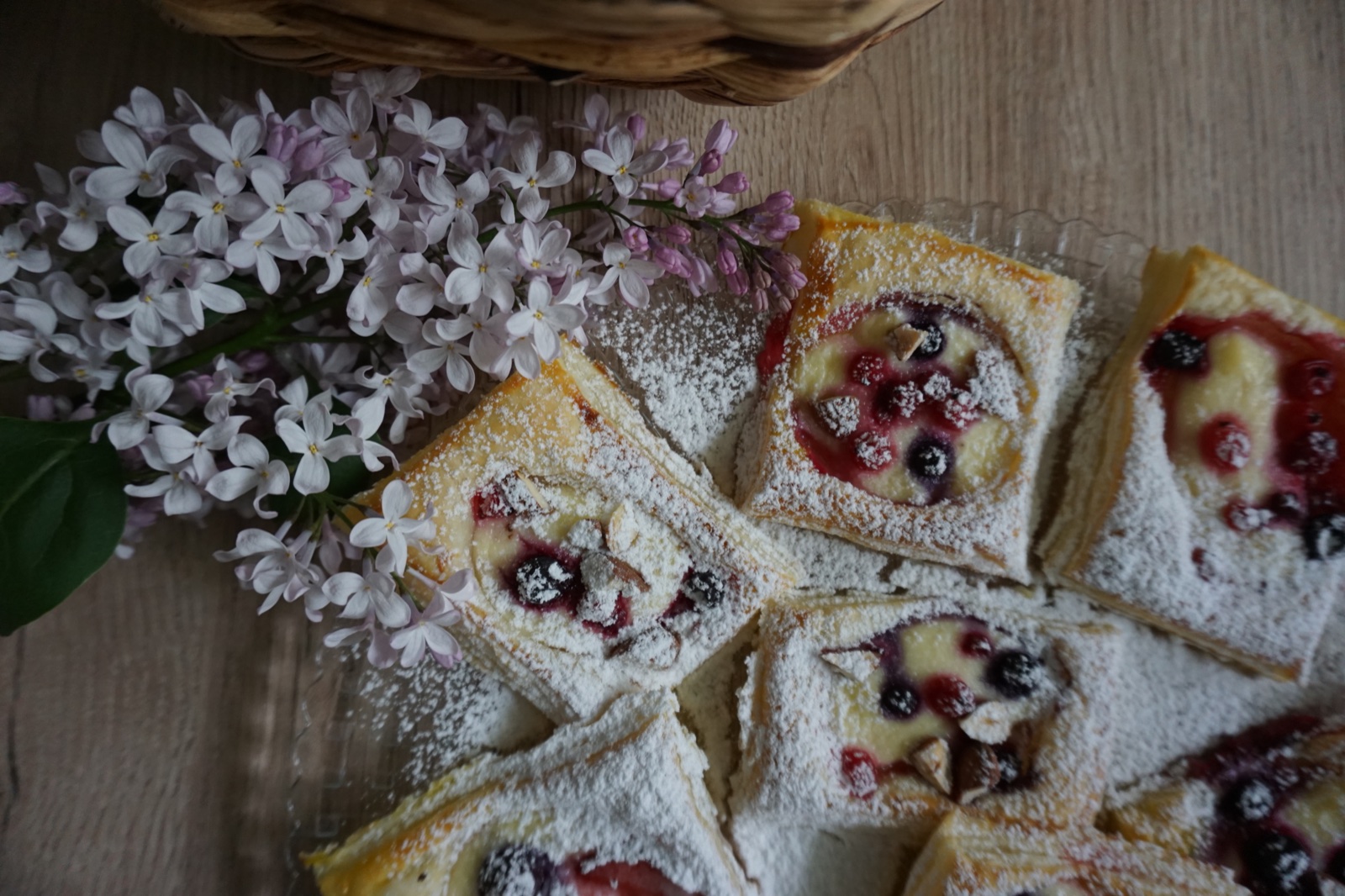 Priamo na plech som si rozložila listkove cesto, nakrájala som ho na štvorčeky a na každý štvorček som naniesla vanilkový puding, k tomu som vložila ovocie (čo mrazak dal.. 🍓🫐) a lieskovce🌰 a celé to trošku pokvapkala medíkom 🍯
