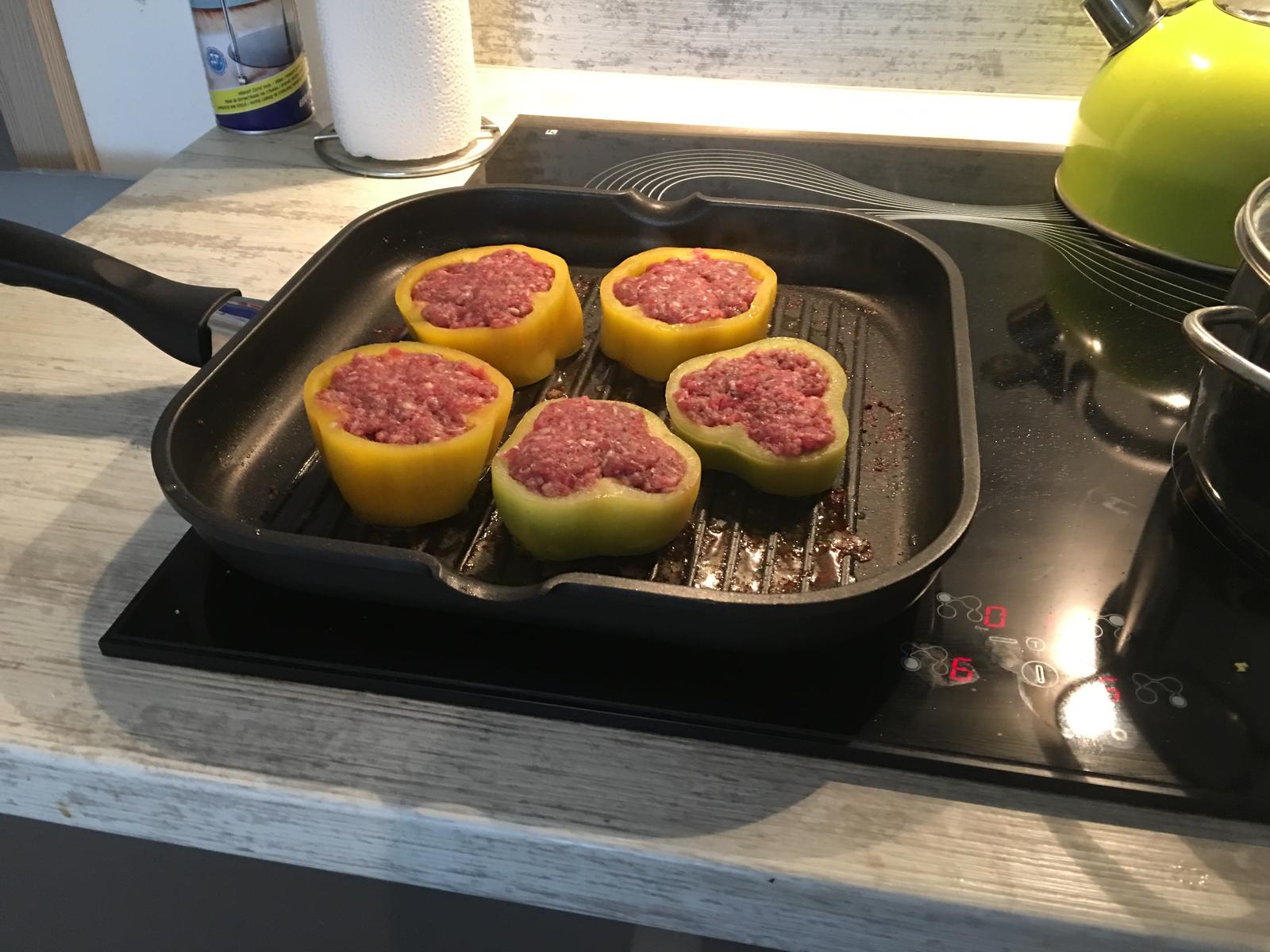 Na grilovaciu panvicu si dáme kvapku olivového oleja a plnené papriky grilujeme z každej strany.