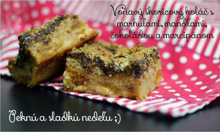 160g kokosoveho oleja, 180g trstinoveho cukru, 180g hladkej muky, 3 vajicka, 3 PL mlieka, 1 CL skorice, 1 CL prasku do peciva - vsetko dokopy zmiesame. polku cesta som dala do plechu, na to som navrstvila marhule, nasekane mandle a marcipan nakrajany na kusky. Dala som zvysok cesta, posypala som kuskami cokolady, mandlami, skoricou a trstinovym cukrom (tieto suroviny som davala odoka). Piekla som tak cca 45min na 175st.