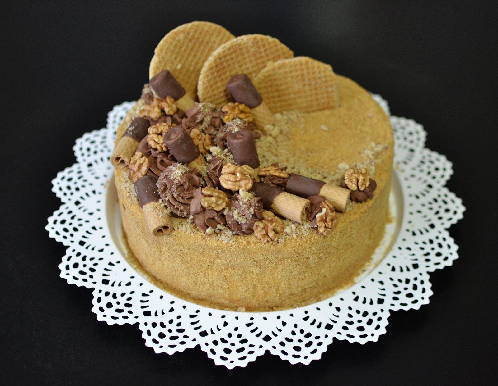 Tento som robila odoka, keďže mi ostal puding z iného dezertu. Hustý vanilkový puding (dávam tak 300ml mlieka na 1ks) pridáme do masla, ktorý sme si vyšľahali s cukrom. Pozor, obe suroviny musia mať rovnakú teplotu, aby sa nezgrcli. Krém som rozdelila na 2 časti a do jednej som pridala mleté vlašské orechy, ktoré som predtým ešte osmahla na panvici a nechala vychladnúť. Každý plát potrieme slivkovým lekvárom a krémy striedame – plát, karamelový krém, plát, vanilkový krém, plát, orechová krém atď. Necháme najlepšie cez noc stuhnúť. Na potretie torty som si vyšľahala mascarpone s troškou šľahačky a so Salkom (dávala som neskaramelizované). Potrela som tortu a posypala odrezkami z plátov, ktoré som si rozmixovala najemno.