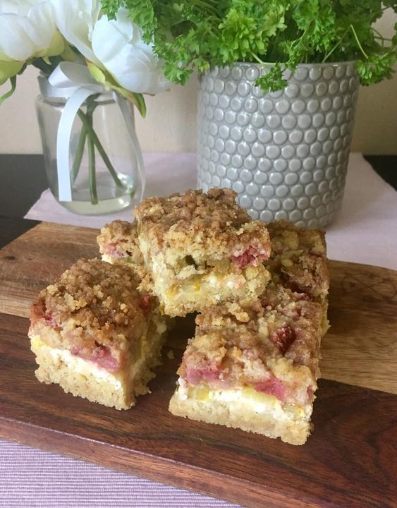 Zmiesame si muku, vlocku, cukor, prasok do peciva a rozpustene maslo. Premiesame, aby sme dostali jemnucku akoby mrvenicku. Mozeme pokojne iba rukou, pripadne ja som premiesala v mixeri s takym tym padlovym nadstavcom. 2/3 z posypky nasypeme do vymasteneho plechu. Tvaroh si podla chuti ochutime cukrom, prdame zltka, smotanu a Zlaty klas. Ja som pouzila jeden vanilkovy tvaroh, ktory je riedky, tak som plnku mala riedku a vyliala som ju. Ak pouzijete hustejsi tvaroh, plnku na posypku nakopkujete. Rebarboru ocistime, nakrajame a premiesame s trst.cukorm a skoricou. Navrstvme na tvarohovu plnku, taktiez nakrajame jahody a pridame ich na rebarboru. Ovocie zasypeme zvysnou posypkou. Ja som este dodatocne spravila mrvenicku z 50g masla, 50g spaldovej hl. muky, 50g trst.cukru a 30g mletych orechov, ktoru som este pomrvila na kolac. Pecieme pri 175st. cca 50min, treba odlsedovat. Kolacik je najlepsi, ked trosku postoji. Ja som ho piekla vecer a na dalsi den bol vynikajuci, stavnaty 👍