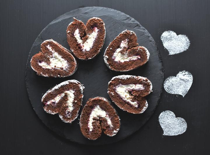 Vychladnutú roládu potrieme štedrou dávkou lekváru (ja dávam najradšej ríbezľový alebo višňový). Potrieme plnkou a stočíme do tvaru srdca (alebo sa o to pokúsime 😛). Dlhšie strany korpusu prehnite ku stredu. A potom v mieste spoja opäť prehnite. Ja som to najprv skúsila na nenaplnenej roláde. Nechajte dobre stuhnúť. Môžete ešte obaliť v pr. cukru, prípadne poliať čokoládou. Potom už stačí iba pokrájať 🙂