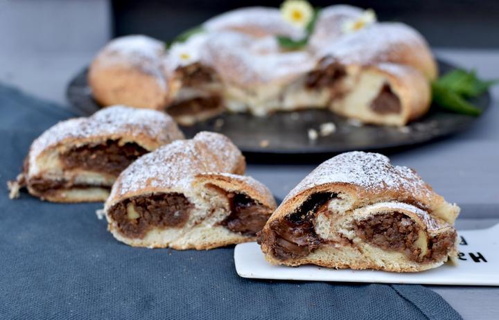 Vo vlažnom mlieku s trochou cukru si spravíme kvások. Potom si dáme do malého hrnca vodu, mlieko, múku a uvaríme hustejšiu kašu. Odstavíme, prikryjeme fóliou a necháme vychladnúť. V mise si dohladka vymiešame vychladnutú kašu, kvások, roztopené alebo zmäknuté maslo a vajce. Pridáme zvyšné sypké suroviny a dobre miesime. Ja som dala cesto do robota a nechala ho miesiť cca 15min. Ak je príliš riedke, môžete pridať múku, ak husté, mlieko. Vymiesené cesto dáme do misy potretej olejom vykysnúť. Rozdelíme potom na dve časti. Každú rozvaľkáme na dlhý slíž. Potrieme pozdĺžne v strede lekvárom (konce nechajte suché, aby sa dali dobre zavrieť). Ja som jeden naplnila nugátom a druhý orechovou plnkou. Tú som spravila tak, že som si zmiešala mleté vlašské orechy, škoricový cukor, trochu teplého mlieka a roztopené maslo. Naplnený slíž potom poriadne pozatvárate, aby nám plnka nevytiekla. Tieto naplnené záviny potrieme roztopeným maslom a obsypeme škoricovým cukrom. Potom ich prepletieme. Ja som plietla tak, že som začínala v strede. Prepletali sa tak jednoduchšie. Prekrížite ich v strede a najprv prepletiete jednu a potom druhú stranu. Opatrne ich premiestnite do formy na pečenie alebo na plech, Môžete ešte posypať škoricou. Necháte ešte chvíľu takto nakysnúť a potom pečiete na 175 st. dozlatista, cca 30-40min, záleží od rúry. Ak sa vám vrch pripaľuje, ale ešte sa vám to nezdá dopečené, stačí ho prikryť alobalom alebo papierom na pečenie 🙂