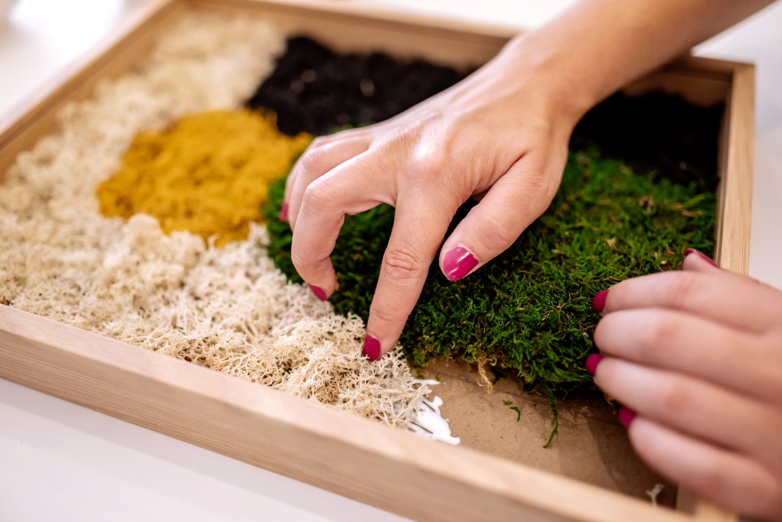 Kým sa pustíte do práce, vyberte si vhodnú pracovnú plochu. Je potrebné myslieť na to, že stabilizovaný mach mierne púšťa farbu (ak sa chcete vyhnúť zafarbeným prstom, použite rukavice). Rovnako z neho môžu vypadávať ihličie a iné nečistoty. Taktiež ho budete musieť pravdepodobne strihať, čo rovnako narobí nejaký ten neporiadok.