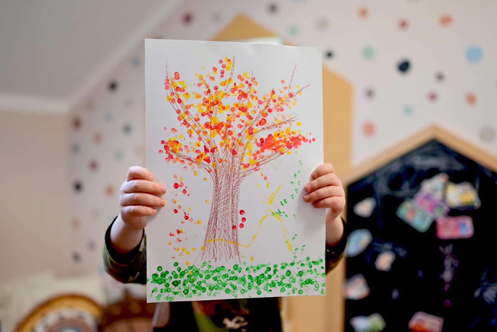 Na papier si nakreslite kmeň stromu s konármi. Potom už prenechajte veľdielo malému umelcovi. Dajte mu do rúk vatovú tyčinku, ktorú si bude namáčať do farby. Môžete bodkovať iba jednou tyčinkou, ale taktiež môžete použiť tento trik: spojte niekoľko tyčiniek gumičkou.