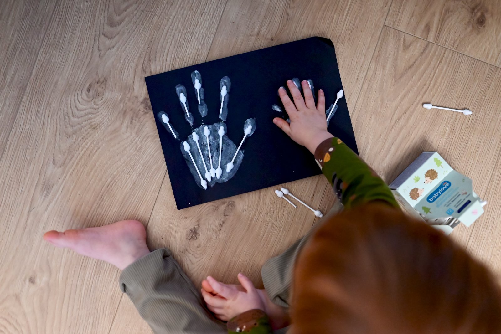 Jedným z najjednoduchších a najzákladnejších projektov pre malých výtvarníkov je odtláčanie rúk či nôh. Stačí len trochu farieb bezpečných pre detskú pokožku, papier a fantáziu. Okrem toho, že viete odtlačky rúk a nôh dokresliť a vytvoriť tak rôzne zvieratká či iné tvory a objekty, viete ho využiť napríklad aj na takýto "röntgenový" snímok ruky.