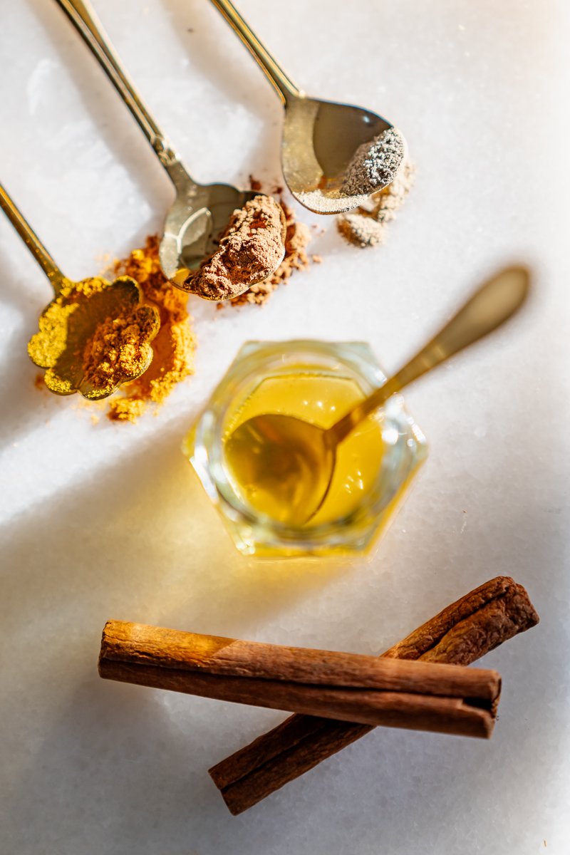 - Odstavte, nechajte mierne vychladnúť, môžete precediť cez jemné sitko. Po miernom vychladnutí pridajte mlieko ghee (prípadne môžete aj kokosový olej) a med.